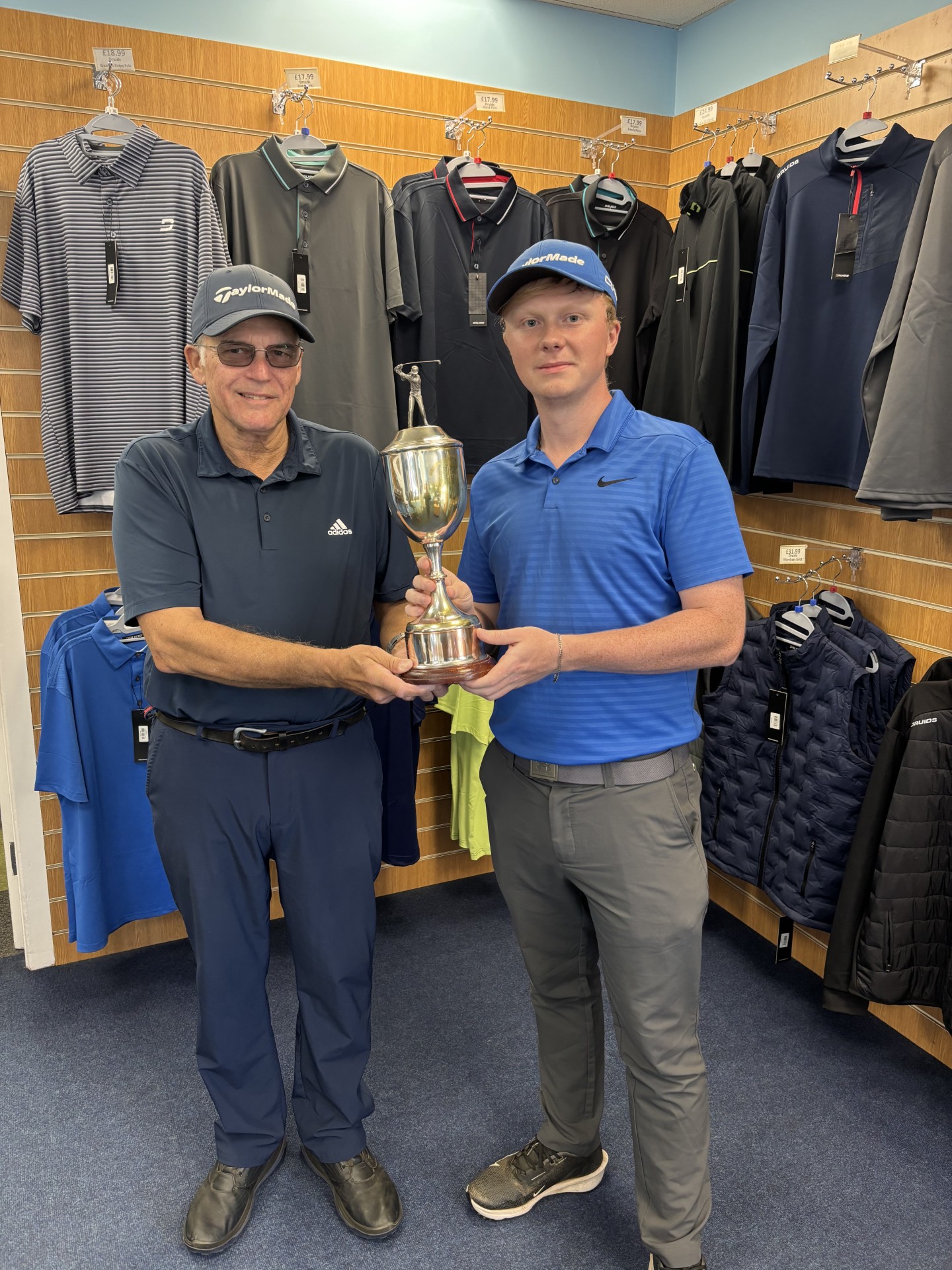Despite Kieran giving 19 shots to Tom, he hung on very well to be 1 down after 12 holes. But a 3 hole burst from Tom on 13, 14 and 15 sealed the win and Tom's first major trophy.