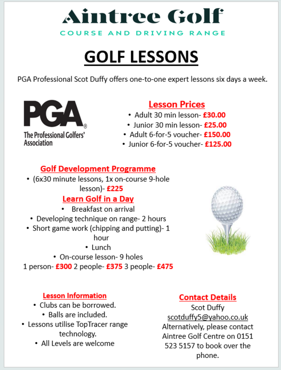 If you would like to purchase a Golf Lesson Voucher or one of Scot’s Golf Packages then please contact Scot via email at scotduffy5@yahoo.co.uk or come in to the Pro Shop at Aintree Golf Centre. Payment must be made by card and a voucher can be sent to you or collected in person.